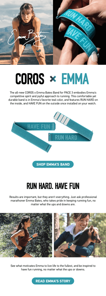As the athlete manager for professional marathoner Emma Bates, I pitched the idea of a custom COROS band for the PACE 3 watch. We printed “Run Hard, Have Fun”, the words her late father would tell her before every race, on a teal nylon COROS band. The band sold out instantly, and remains my favorite project to date.